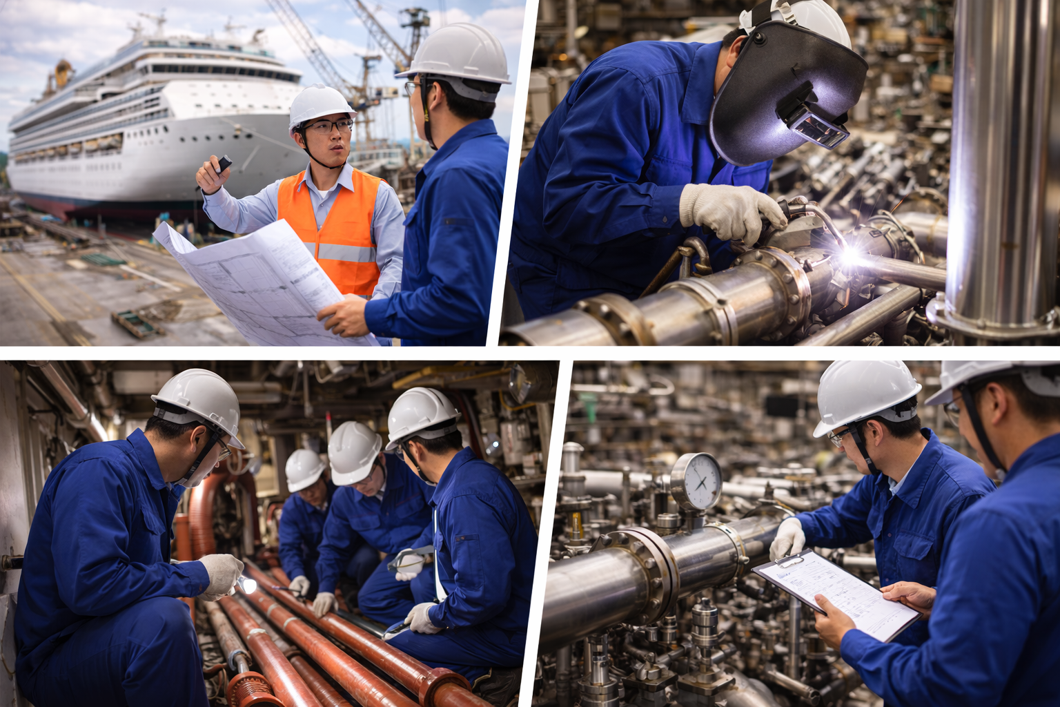 **配管・溶接・検査という“船の機能を支える部分”**です。