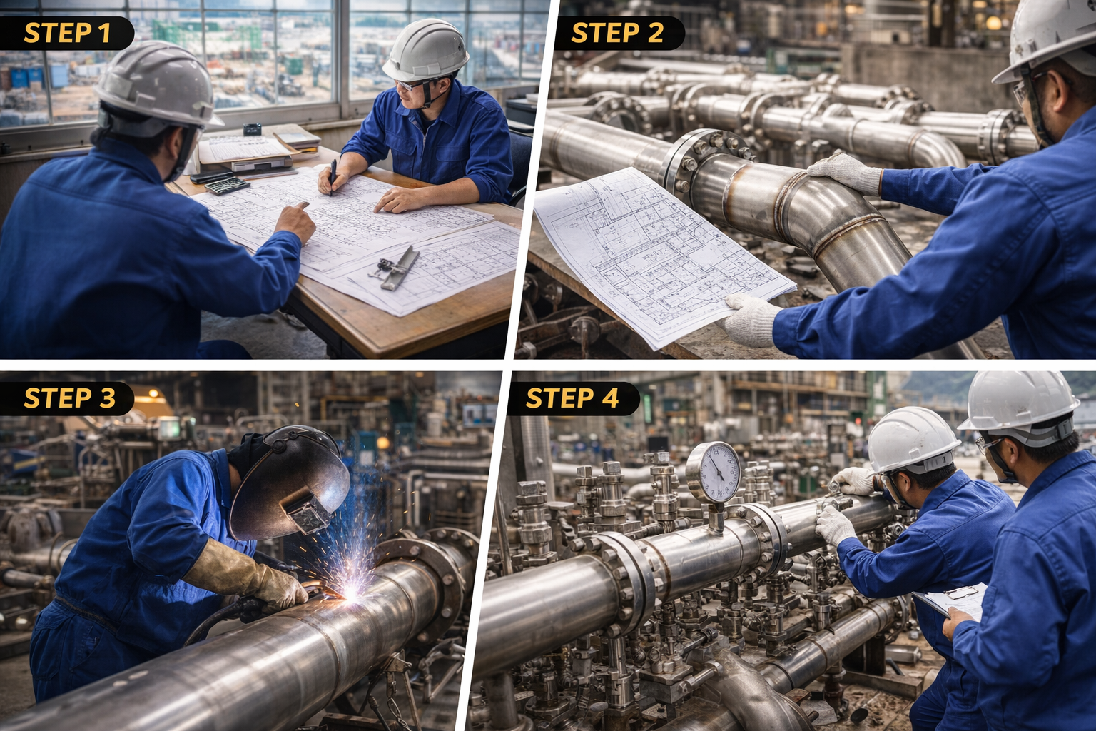 株式会社谷工業では、配管取り付け・溶接完了後、